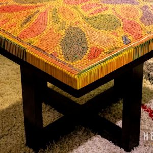 Đó không chỉ là gỗ, đó còn là những cây bút chì 36 sắc màu rực rỡ được người nghệ sĩ khéo léo tạo nên những chiếc bàn phòng khách có 1 không 2.